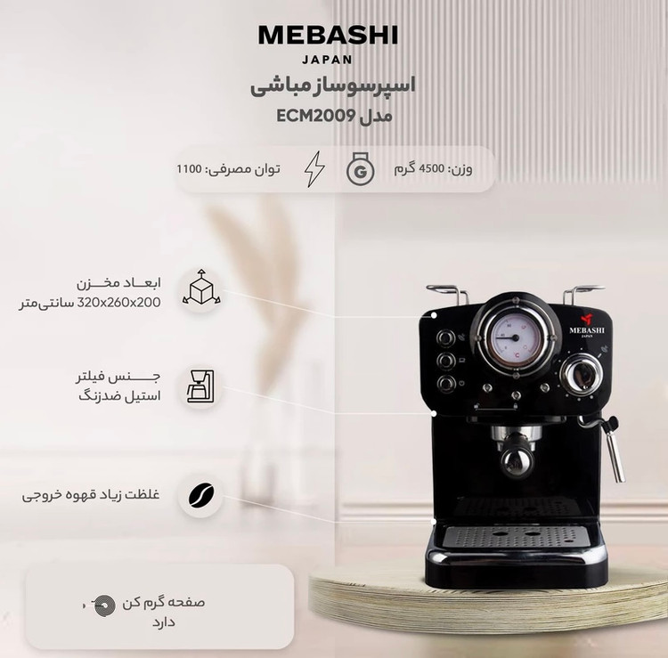 ما همیشه دنبال لوازم خانگی برای خانه مان می گردیم که علاوه بر کیفیت و کارایی بالا دارای ظاهر زیبا و فانتزی جهت ست کردن با سایر وسایل نیز باشد اسپرسوسازها نیز از این دسته مستثنا نیستند پیشنهاد ما به شما دستگاه اسپرسوساز و کاپوچینوساز مباشی مدل 2009 است ECM2009 مناسب برای مصارف خانگی ، محل کار ، سوپرمارکت ها ،کافی شاپ ها کوچک و مکانهای مشابه است .اسپرسوساز و کاپوچینوساز مباشی یک دستگاه نیمه صنعتی و همراه با تکنولوژی روز ژاپن است که دارای رنگ بندی است و جلوه خاصی به آشپزخانه و کافه شما میبخشد. این مدل با کرمای عالی نشان دهنده ی قدرت بسیار خوب است. اسپرسوساز و کاپوچینوساز مباشی 2009 دارای پیچ تنظیم بخار است.با فشار بخار 20 بار و با ظرفیت توان 1100 وات مجهز به نشانگر درجه حرارت، سیستم قطع خودکار و نازل تولید بخار است که از آن برای تهیه کاپوچینو و کف شیر و انواع نوشیدنیهای گرم استفاده می شود. این اسپرسو ساز آبِ جوش را با فشار خیلی زیاد از بین دانههای قهوهٔ آسیاب شده ریز میگذراند. قهوه اسپرسو غلیظتر از قهوههای دیگر بوده را خارج می کند و میتوانید آن را نوش جان کنید. این دستگاه مجهز به صفحه ی گرم نگهداره ی فنجان است که به شما کمک میکند تعداد بیشتری فنجان قهوه را پیش گرم کنید و از نوشیدن یک فنجان اسپرسو خوب لذت ببرید.در این دستگاه از بویلر و پمپ آب قویتری استفاده شده است که بر روی درجه حرارت قهوه خروجی و همچنین بخار آب تاثیر گذار است.